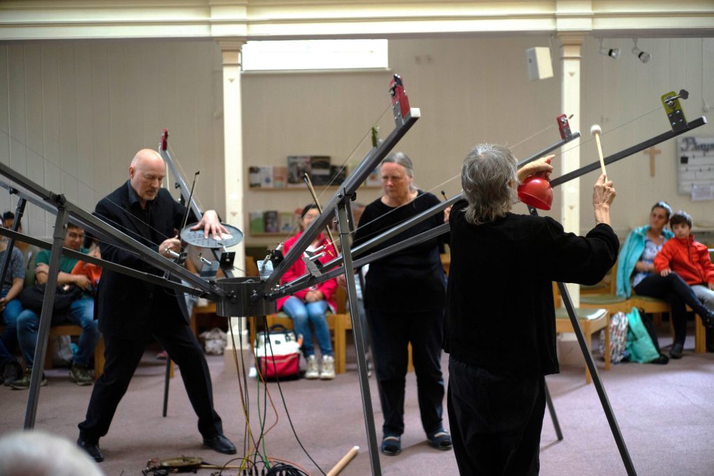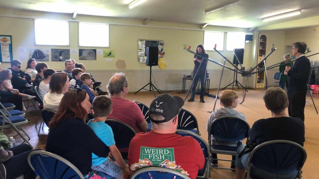 During the summer of 2024, thanks to a grant from Arts Council Wales, we were able to tour the Spider round Wales, with a particular focus on engagement with local musicians who were able toattend a workshop and then play in performances. That worked very well. The layout of each venue was quite different, and audiences included families with young children as well as teenagers and adults. Again, audiences were keen to try out playing the spider between performances.